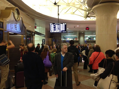 During the rush hour, commuters leaving Manhattan compete for NJ Transit train seats. |